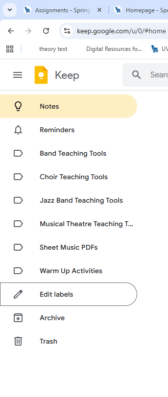 Before this week, I had never heard of Google Keep. I have known for a very long time that I wanted to be a music teacher, and I have been receiving a vast array of resources for the last five years during my undergrad and PDP. I always wanted to keep them somewhere safe, so I would have access to them in my first year of teaching; This has proven exceptionally difficult. I wish I had known about Google Keep sooner because I explored it and made content tabs for the different musical ensembles/classes that I will likely teach, as seen in my image. From this point on, I plan to use Google Keep in an effort to keep track of the many resources I will receive from colleagues and professional development seminars.
